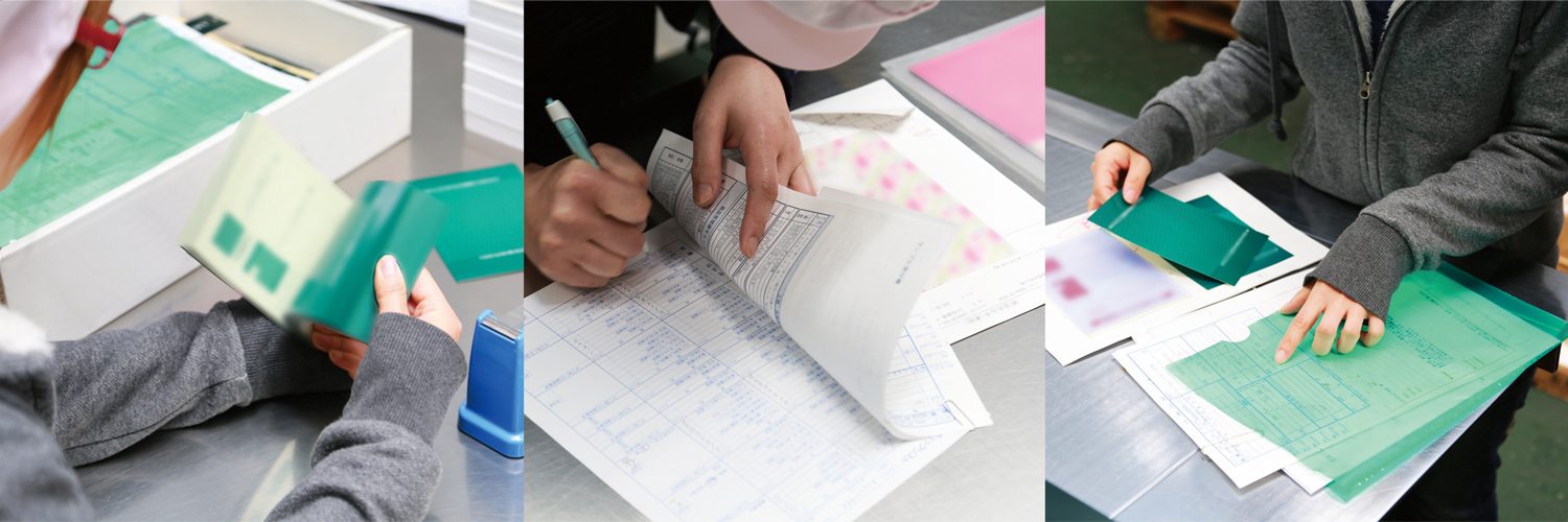 弊社は名刺や封筒などの一般印刷物から商業美術印刷及び紙工分野まで高次元で安定した品質を常にご提供しております。急速なデジタル化に伴う多種多様で複雑なご要望にも臨機応変かつ柔軟にお応えして参りました。これを支えてきたのが品質管理部門です。お客様のご要望通りの商品やサービスを自信を持ってお届けする為、デジタルが主流の今でも五感の精度を研ぎ澄まし、ひとつひとつ検査・検品の手間を惜しみません。