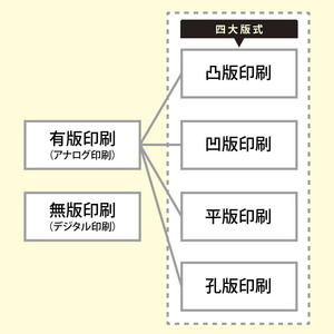 近年の印刷方式は「版」の分類から大きく5つに分類できます。 また「版」使うか使わないかで、「有版印刷」と「無版印刷」に分かれます。 次に有版印刷では、使用する版の属性によって「凸版印刷」「凹版印刷」「平版印刷」「孔版印刷」という4つの方式に分類され、このを「四大版式」といいます。
