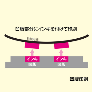 凸版印刷とは反対の印刷方式でデコボコした版の凹部にインクを含ませて印刷します。くぼみの深さによって、インキの付着量を調整し、豊かな濃淡表現が魅力です。