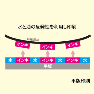 文字通り、凹凸のない平らな版を使用し、水と油の反発作用によって印刷を行います。1796年ゼネフィルダーによってに発明された石版印刷が原点ですが、インキを紙へ間接的に転写させる「オフセット印刷」が確立されてからは、「平版オフセット印刷」が今日の印刷物の大半を占めるまでになりました。