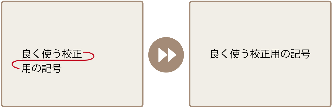 行が分かれている文字列をつなげる場合、前文の末尾と後文の先頭の文字をつないだ記号を入れます。まっすぐ直線にすると文字面にかかってしまうため、文字面を避けて曲線で行間に書き入れます。
