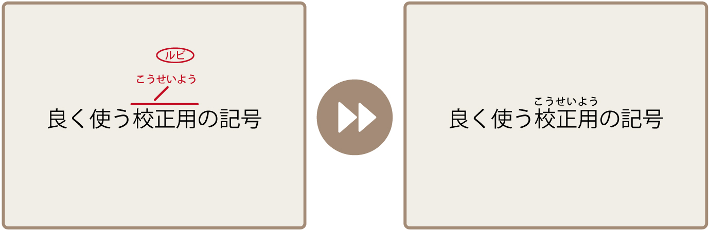 ふりがなは、該当する文字列の上部に線を引き、引出し線の先に書き入れます。ふりがなの上に円弧をつけ、ルビであることを示します。